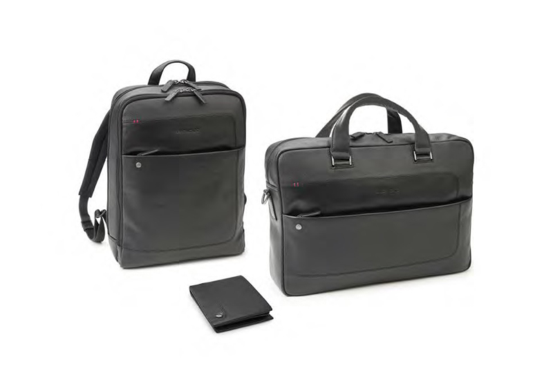 The Alaska collection, complete and well structured, all in leather, consists of wallets, business backpacks that contain 14 and 15.6 inch PCs, men’s bags and crossbody bags. It was made in 2 colours: black and navy blue. The leathers used are 2: a soft dollar, that is a full-grain leather extremely soft to the touch with a light surface embossing, and a second smooth Nappa that creates contrast and embellishes the design of the items. It’s a very fine fullgrain leather, resistant to water and scratches and with good colour fastness. Toneon- tone details, in slight contrast, give an extra touch, as well as the playful and modern style that is combined with the printed and coloured inner lining. The metal logo is round, flush with the surface of the wallet.
